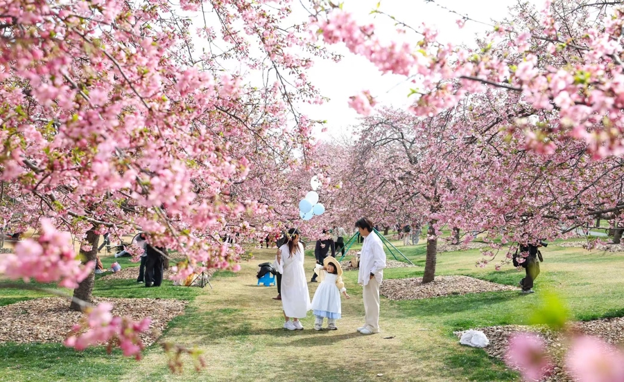 作为上海早樱代表,河津樱是钟花樱与大岛樱的杂交品种,具有先花后叶、花型舒展、花量繁密的特点,观赏价值极高。眼下,辰山植物园内的河津樱已进入最佳观赏期,微风轻拂,粉瓣摇曳,浪漫氛围感十足。核心观赏区位于近1号门的河津樱大道,全长约800米,数百株河津樱沿路列植,形成一道充满梦幻色彩的粉色花廊,成为打卡好去处。