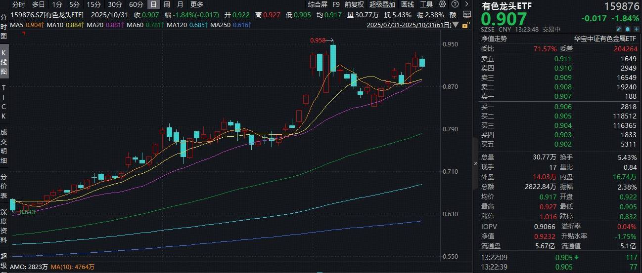 今日(10月31日)揽尽有色金属行业龙头的有色龙头ETF(159876)随市回调,场内价格盘中一度跌超2%,现跌1.84%,但从日k线上看大咖配资,该ETF近日或已走出“上行台阶”,并且站在所有均线上方。